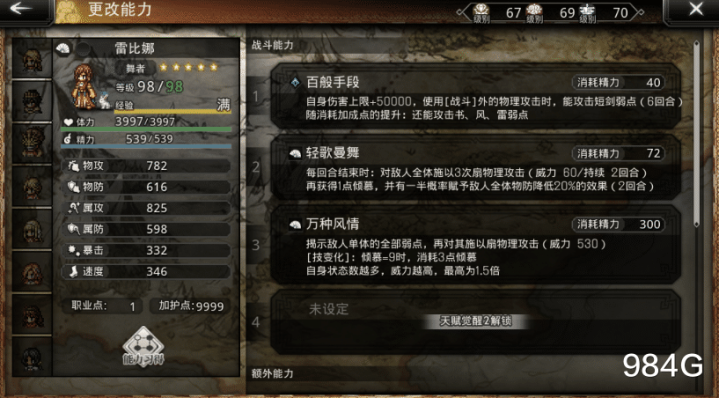 接下来是没提到的、未来可期、大有可为的两位角色,第一位是Ex雷比娜,她与洁哥一样都是国服首发且独有一段时间的角色,扇子等多弱点输出能力不俗,Buff与Debuff能力卓越,强度始终在线并且还有自己的独门绝技,
