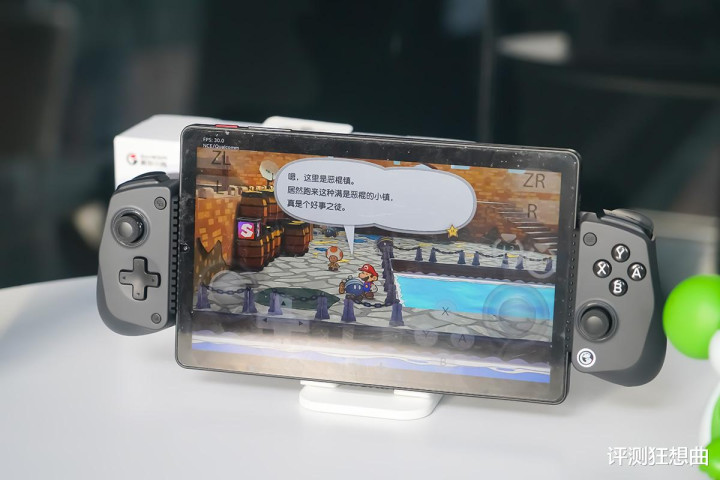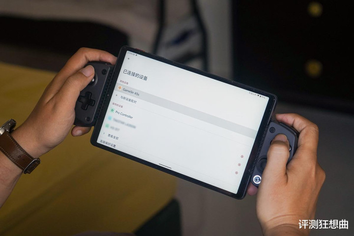 连接完成后,平板的重心恰好落在手柄中央,整体配重非常均衡,长时间举着玩游戏也不会感到腕部疲劳。这点对于平板玩家来说尤为重要,毕竟平板的重量比手机大得多。