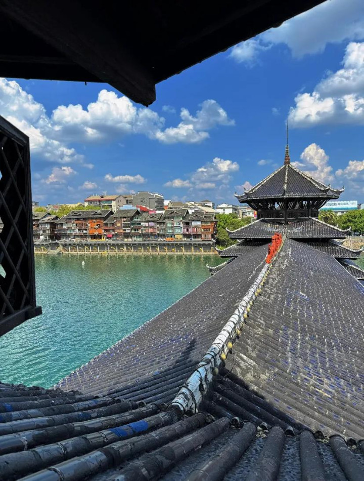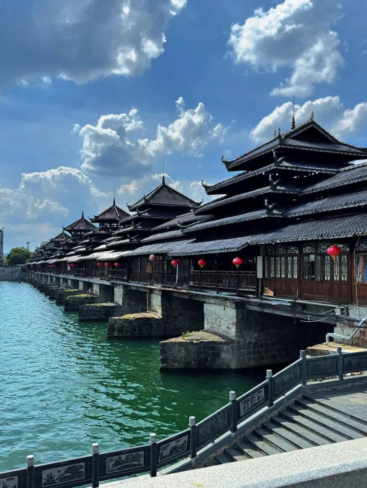 2.龙津风雨桥:亚洲 最长侗族风雨桥,雕梁画栋尽显民族风情。白天观舞水河景,夜晚灯光璀璨映水,氛围感拉满这座桥仿佛是一个小型集市,热闹非凡。基本上所有芷江的小吃都可以吃饭!我吃了坛子菜,很爽口开胃。始建于明代,侗乡建筑,全木质架构,无一钉一铆,史称“三楚西南第一桥”。