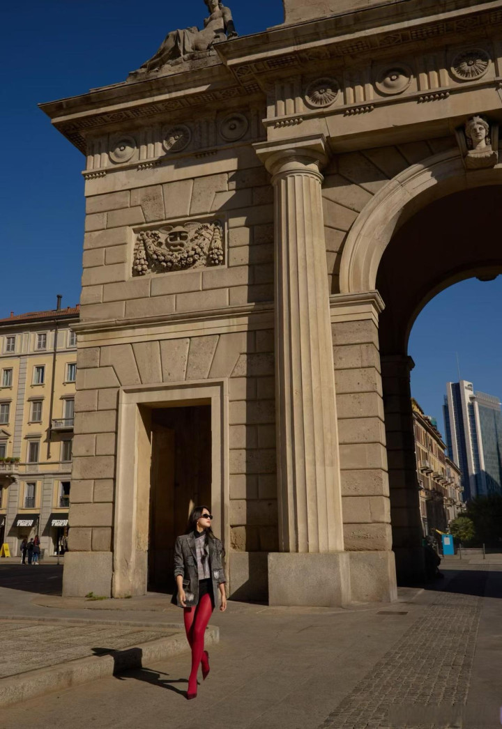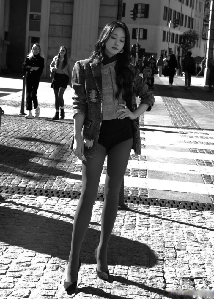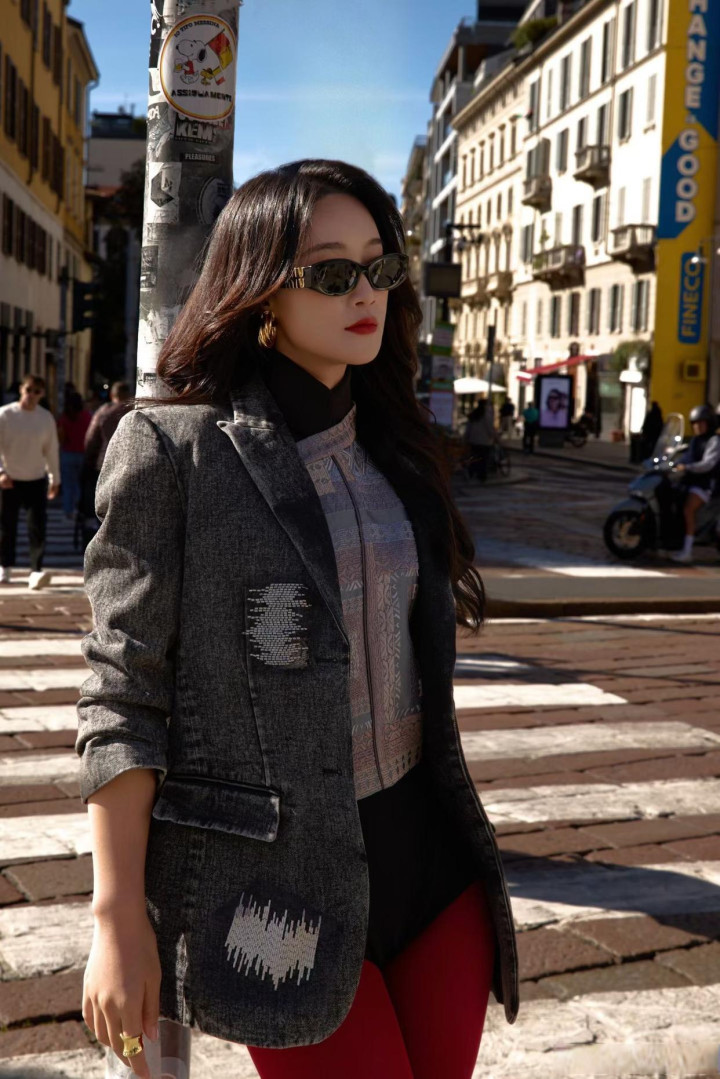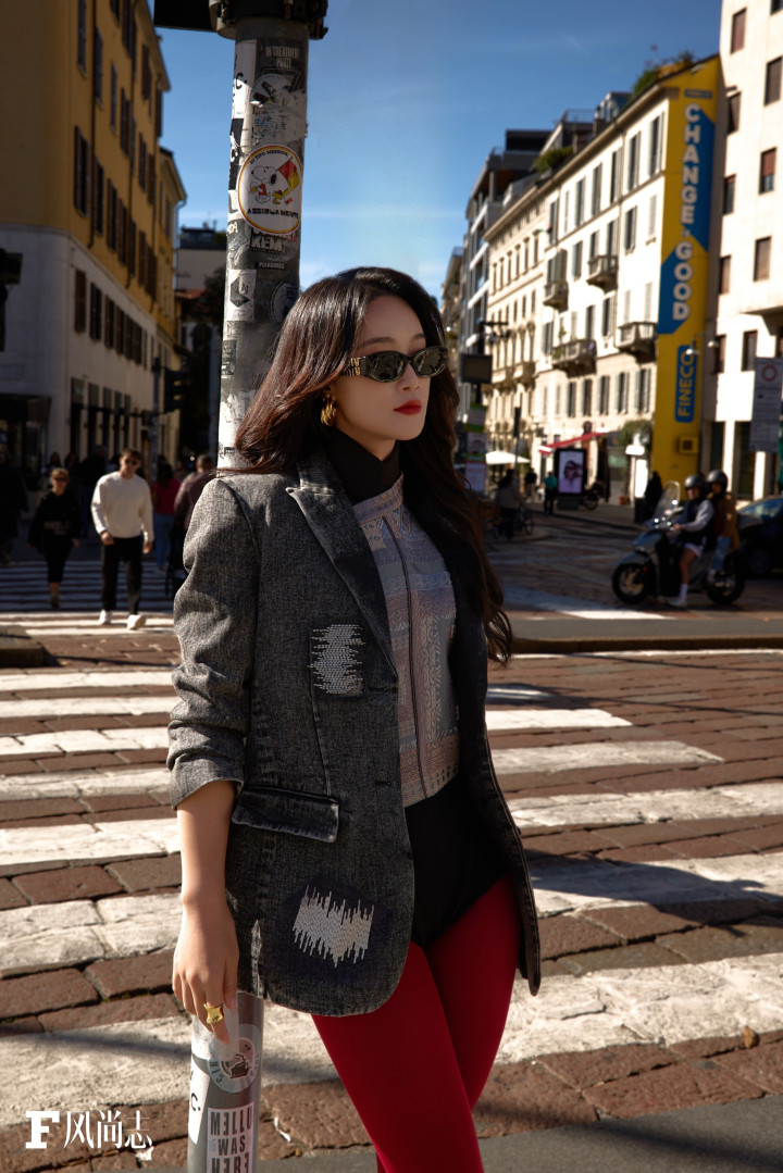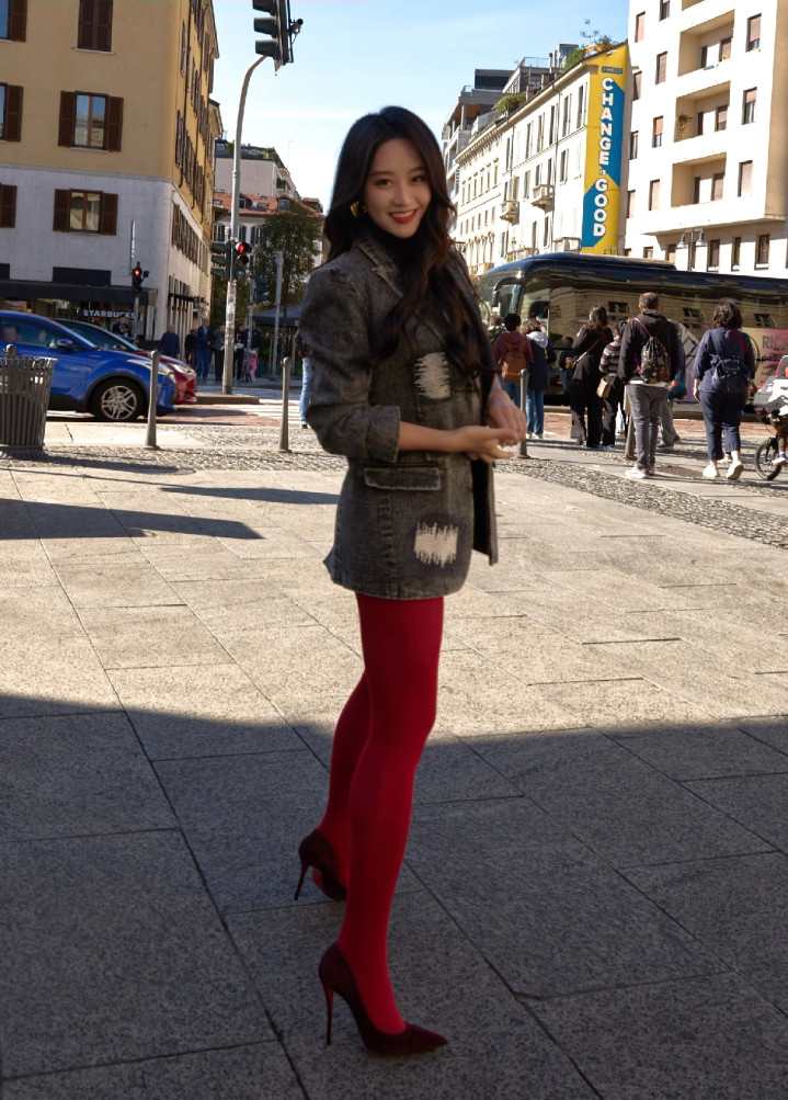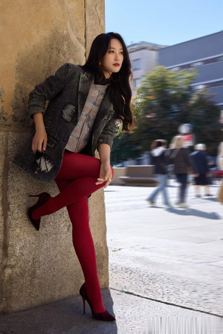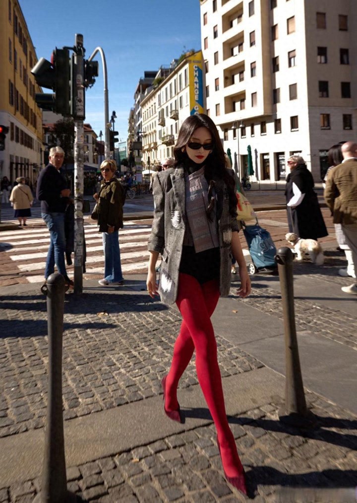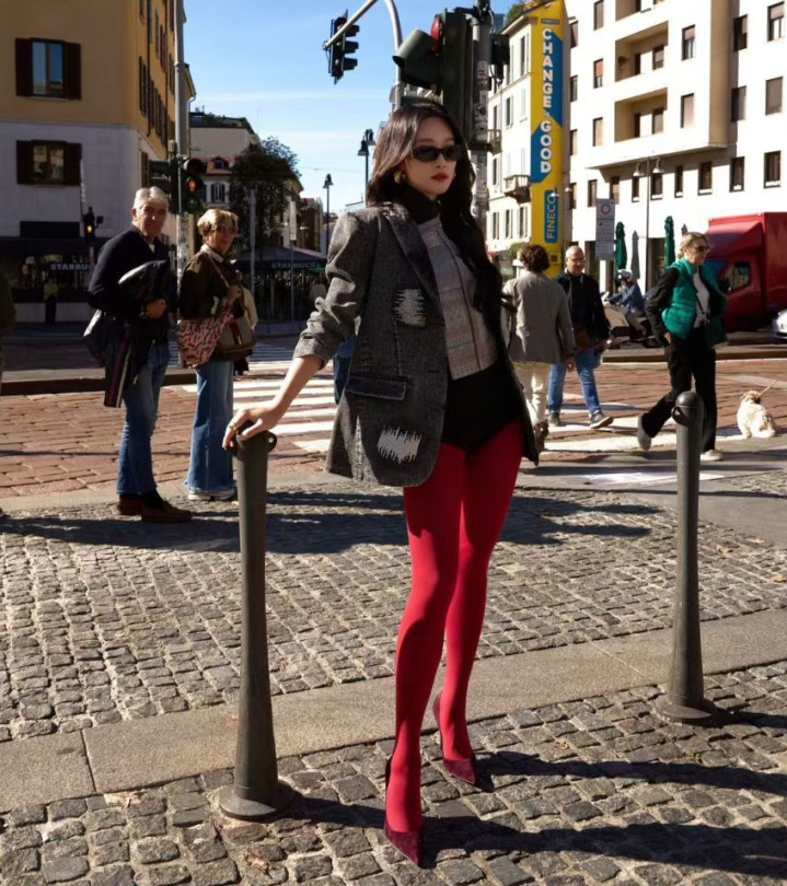 蓝盈莹身穿红丝袜亮相米兰街头, 双腿走路姿势走出了大女主的气势