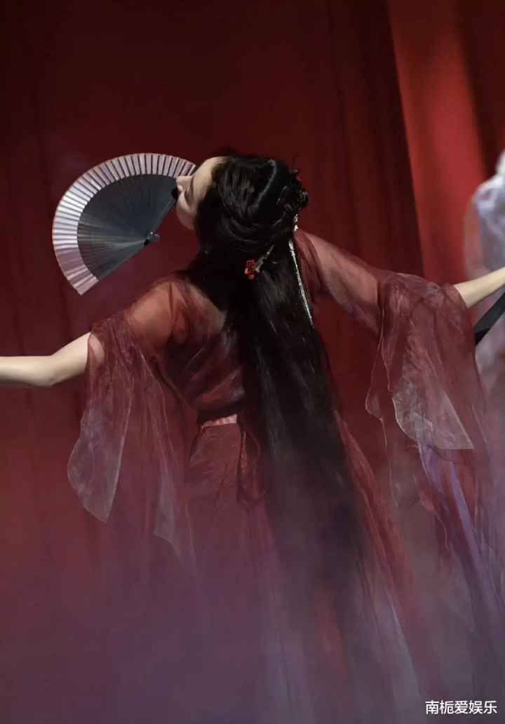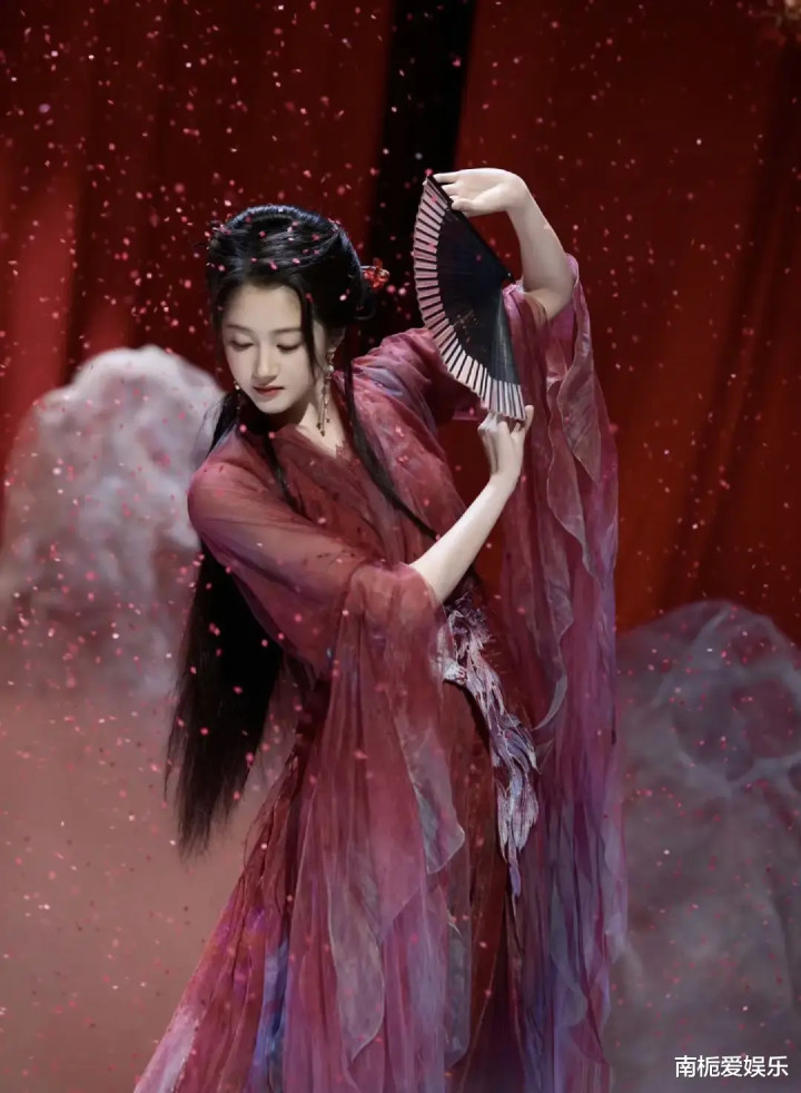 她身披轻盈红纱,执扇而舞,水袖翻飞间巧妙融入戏曲身段,刚柔并济,气韵流转。尤其是那“叼扇回眸”的瞬间,唇角微扬,眼波流转,既有一剑倾城的飒爽英姿,又藏着江湖儿女的缱绻情思,被观众誉为“蛊人名场面”,迅速登上热搜榜首。