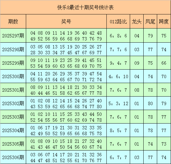 快乐8第2025306期奖号为:03 06 07 14 17 20 21 31 32 36 44 47 48 51 52 55 61 70 76 77,其中奖号012路比为6:7:7,跨度为74。