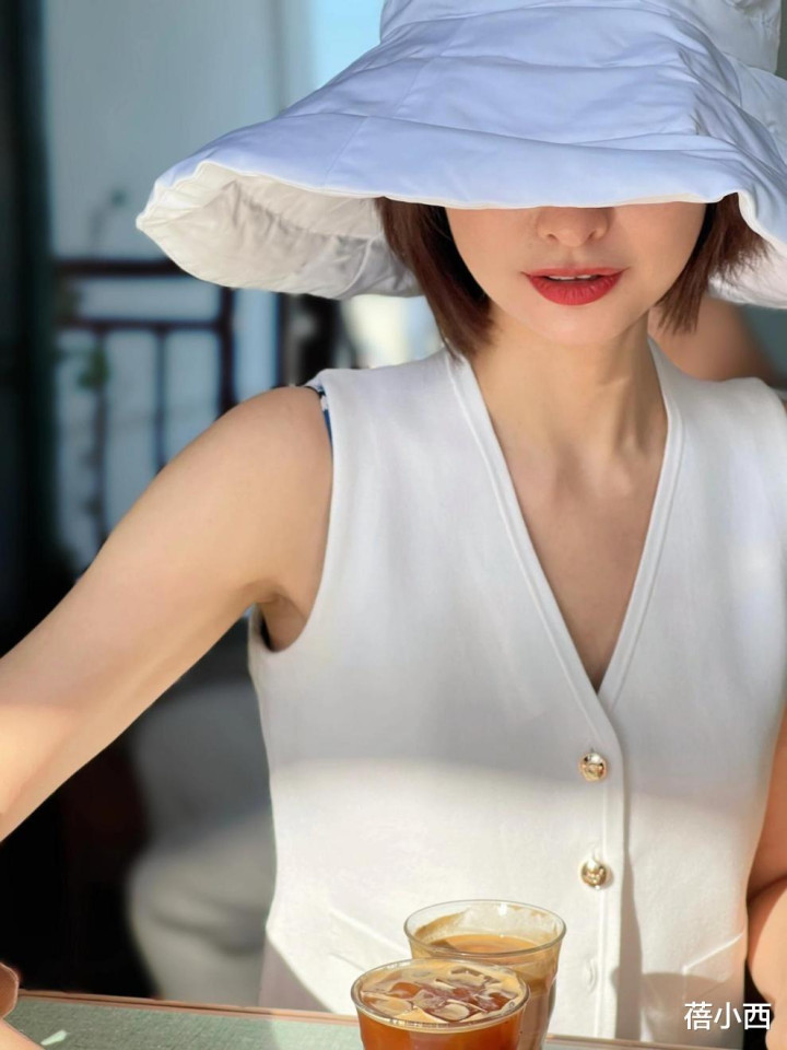单穿马甲十分时髦,身上这款是白色面料,不仅凸显直角肩,纤细的手臂更让人挪不开眼。