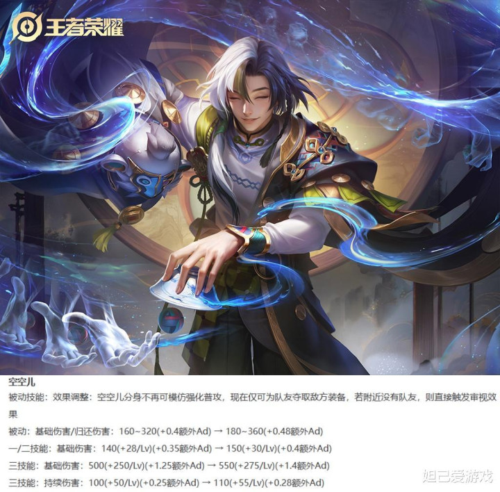 本次调整中,首先就是空空儿的被动,调整后空空儿分身将不再模仿强化普攻,现在仅可为队友夺取敌方英雄装备,若附近没有队友,则直接触发审视效果。