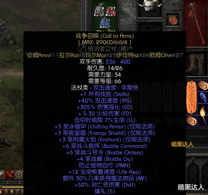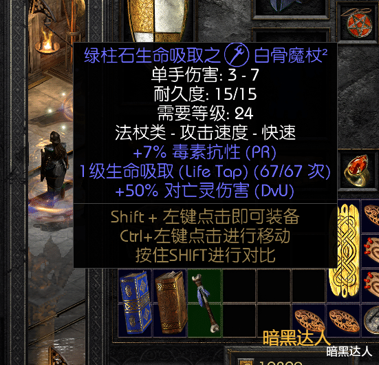 在未刷到能触发生命吸取诅咒的装备(如暗金手套“德古拉之握”)之前,可以也在普通难度第三幕商人“奥玛斯”刷一把带有聚气生命吸取诅咒的单手杖。