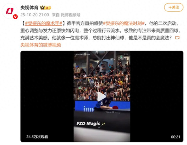 10月20日,央视体育在社交媒体上点名樊振东,直拍展示他被德甲官方盛赞的“魔法时刻”,他的二次启动、重心调整与发力还原快如闪电,整个过程充满艺术美感,“极致的专注带来高质量回球,他就像一位魔术师,总能打出神仙球,他是不是真的会魔法?”这段央视的赞美迅速引爆全网,也让球迷对即将到来的全运会更加期待