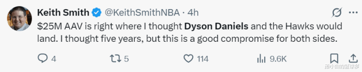 老鹰官方也发推祝贺戴森与球队达成续约,上赛季的戴森场均14.1分5.9篮板4.4助攻3.0抢断,他是自95-96赛季手套佩顿后场均抢断最高的球员,他已经是联盟最顶尖的防守者。